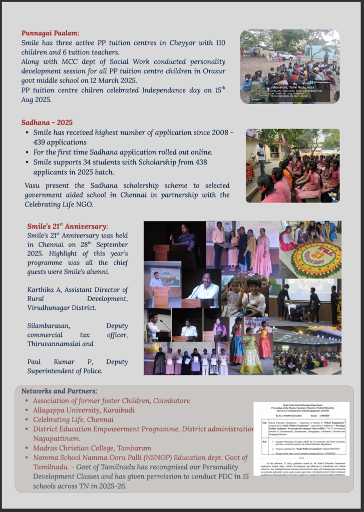 - 21st Anniversary Celebration: Smile’s 21st Anniversary was held on 28 September 2025 in Taramani, Chennai.
